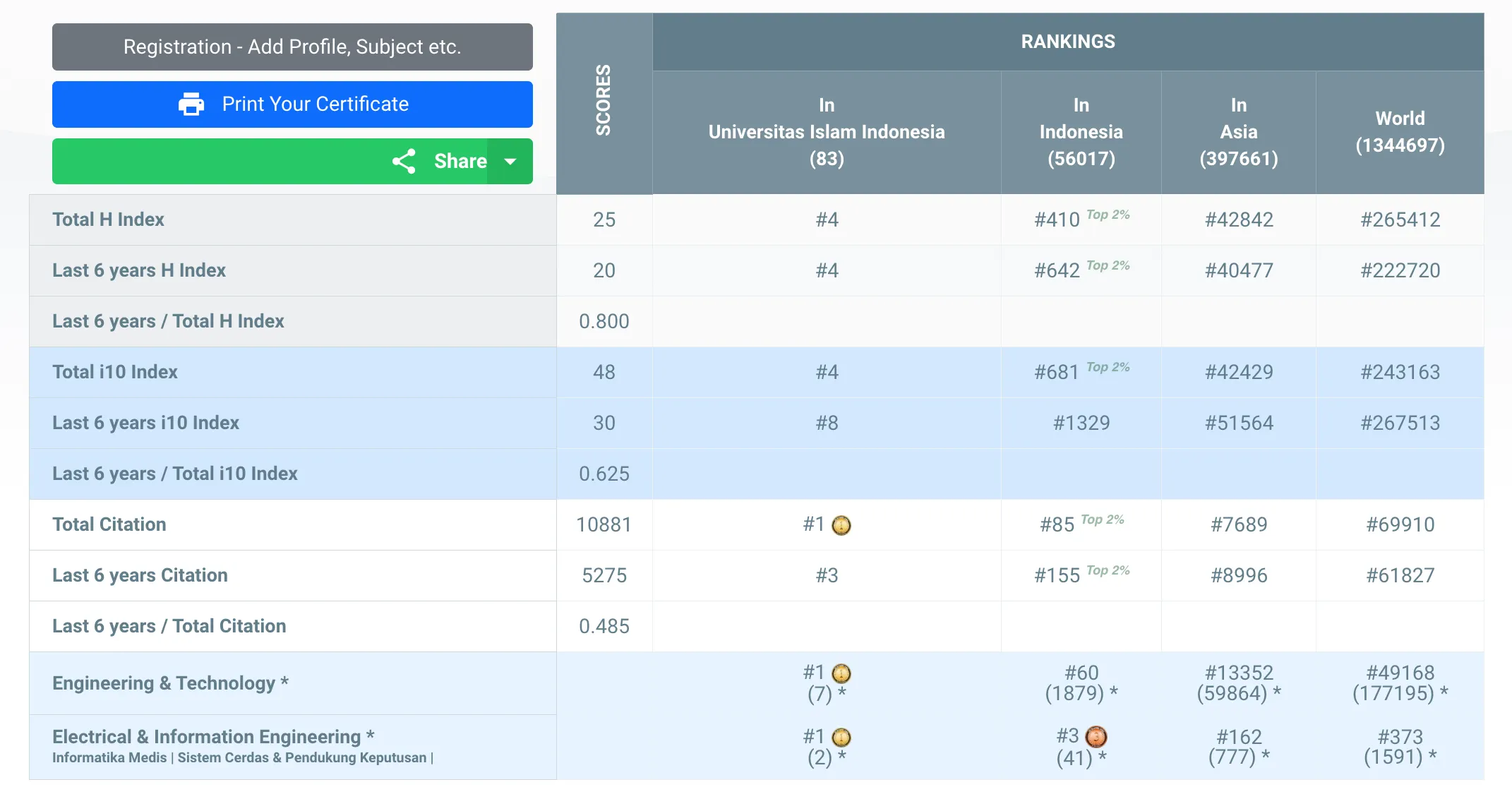 Dengan hasil skor yang tertera di bawah, Sri Kusumadewi menempati peringkat #4 Universitas (Universitas Islam Indonesia), #410 Indonesia, #42842 Asia, #265412 Dunia secara keseluruhan subjek yang termasuk ke dalam kategori AD Scientific Index 2023.