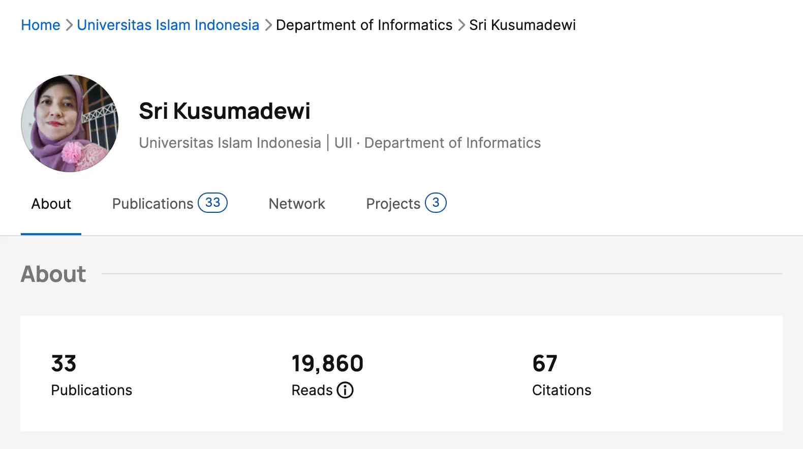 Pada akun Google Scholar milik Dr. Sri Kusumadewi, S.Si., M.T. terdaftar 156 publikasi sejak tahun 1997 hingga saat ini (2023). Sedangkan pada Research Gate miliknya, Dr. Sri Kusumadewi, S.Si., M.T. memiliki 33 publikasi dengan sitasi sebanyak 67.