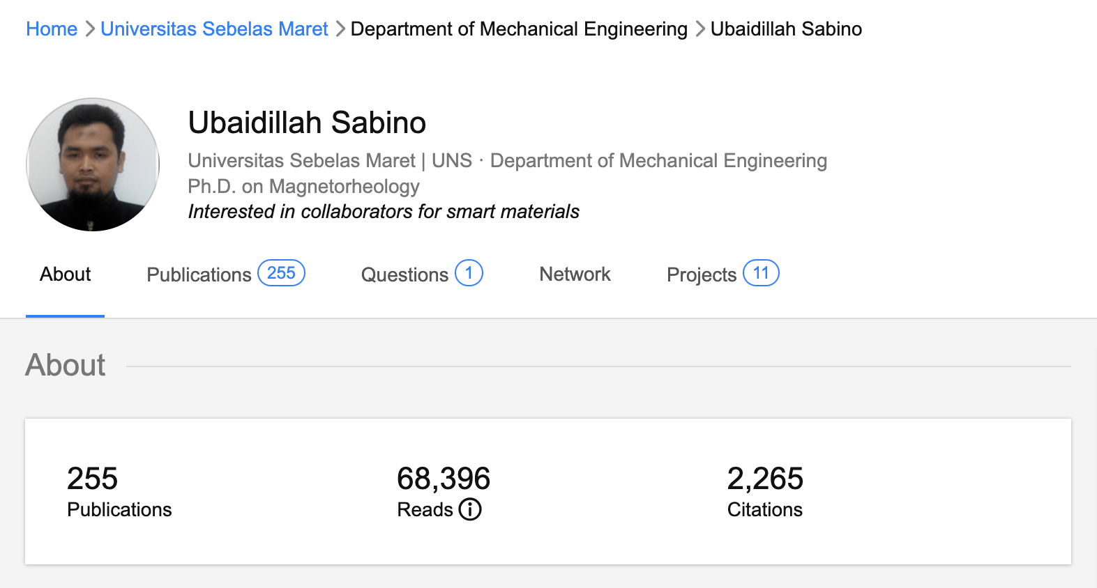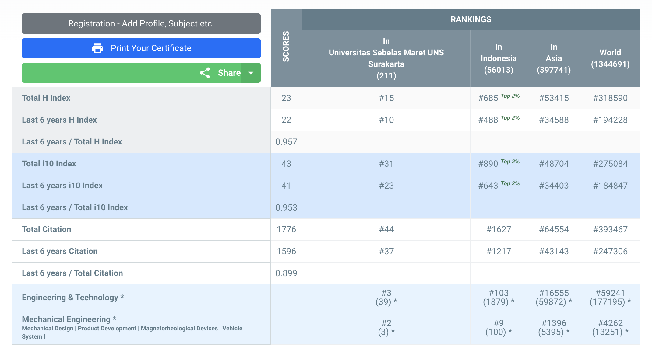 Teknologi.id - Ubaidillah menempati peringkat 92 'Indonesia Top 10.000 Scientist' kategori Subjek Engineering & Technology. Pemeringkatan ini dilakukan oleh AD Scientific Index yang merupakan sistem pemeringkatan dan analisis berdasarkan kinerja ilmiah dan produktivitas dari sebuah universitas dan/atau seorang ilmuan. Pemeringkatan yang dilakukan setiap tahunnya oleh SD Scientific Index ditetapkan berdasarkan parameter total, 5 tahun terakhir, dan rata-rata i10-index, h-index, dan citation score yang diperoleh dari data Google Scholar masing-masing ilmuan.
