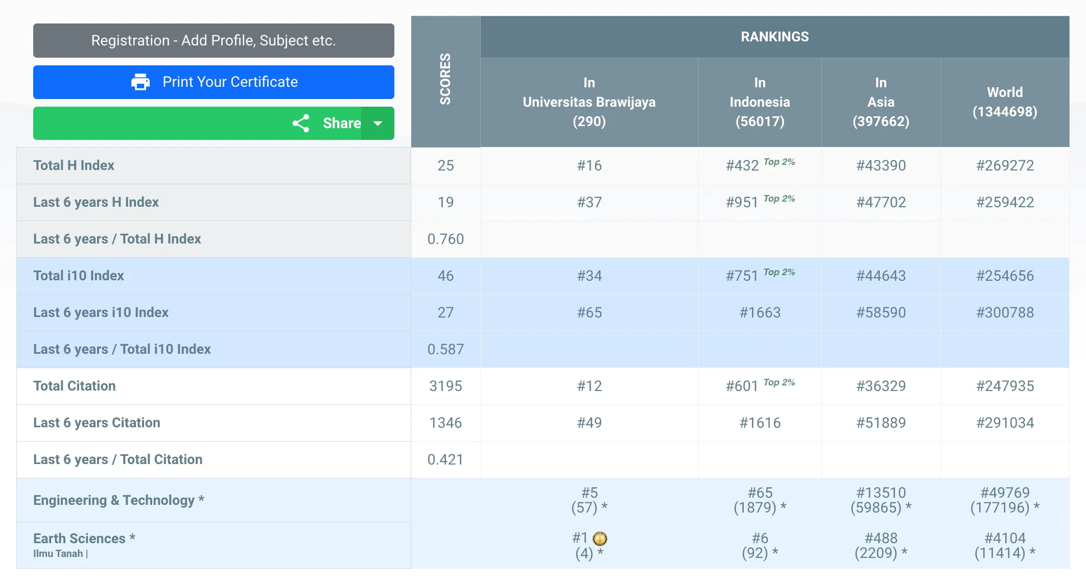 Dengan hasil skor yang tertera di bawah, Wani Hadi Utomo menempati peringkat #16 Universitas (Universitas Brawijaya), #432 Indonesia, #43390 Asia, #269272 Dunia secara keseluruhan subjek yang termasuk ke dalam kategori AD Scientific Index 2023.