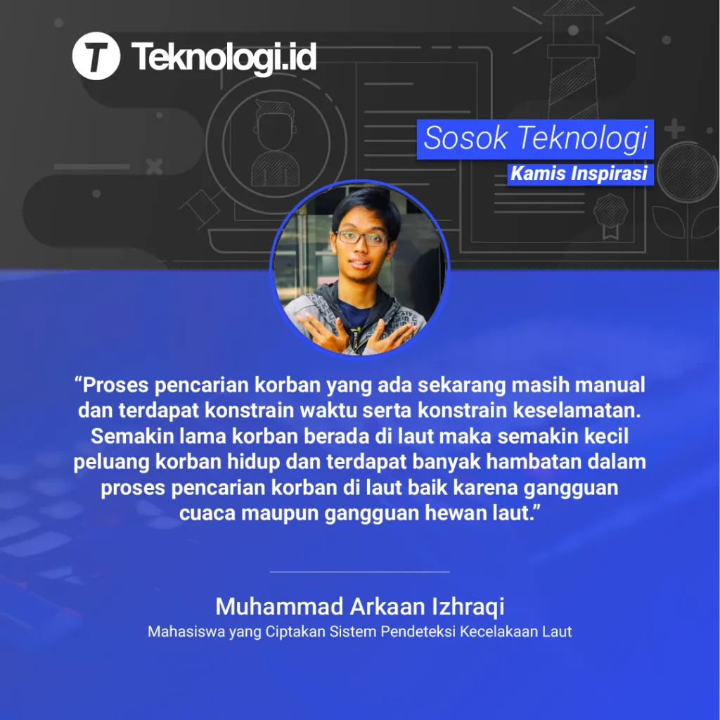 Halo Sobat Teknologi! Pada segment #SosokTeknologi di #KamisInspirasi kali ini, Teknologi.id mewawancarai sosok mahasiswa inovatif dan kreatif dari Institut Teknologi Bandung (ITB) Bandung, yakni Muhammad Arkaan Izhraqi atau biasa disapa Arkaan. Arkaan, bersama teman-teman satu tim nya diantaranya, Nyoman Abiwinanda dan Adinda Sekarwangi berhasil menciptakan cara baru dalam mendeteksi korban kecelakaan di laut yang dinamakan Human Detection System (HDS).