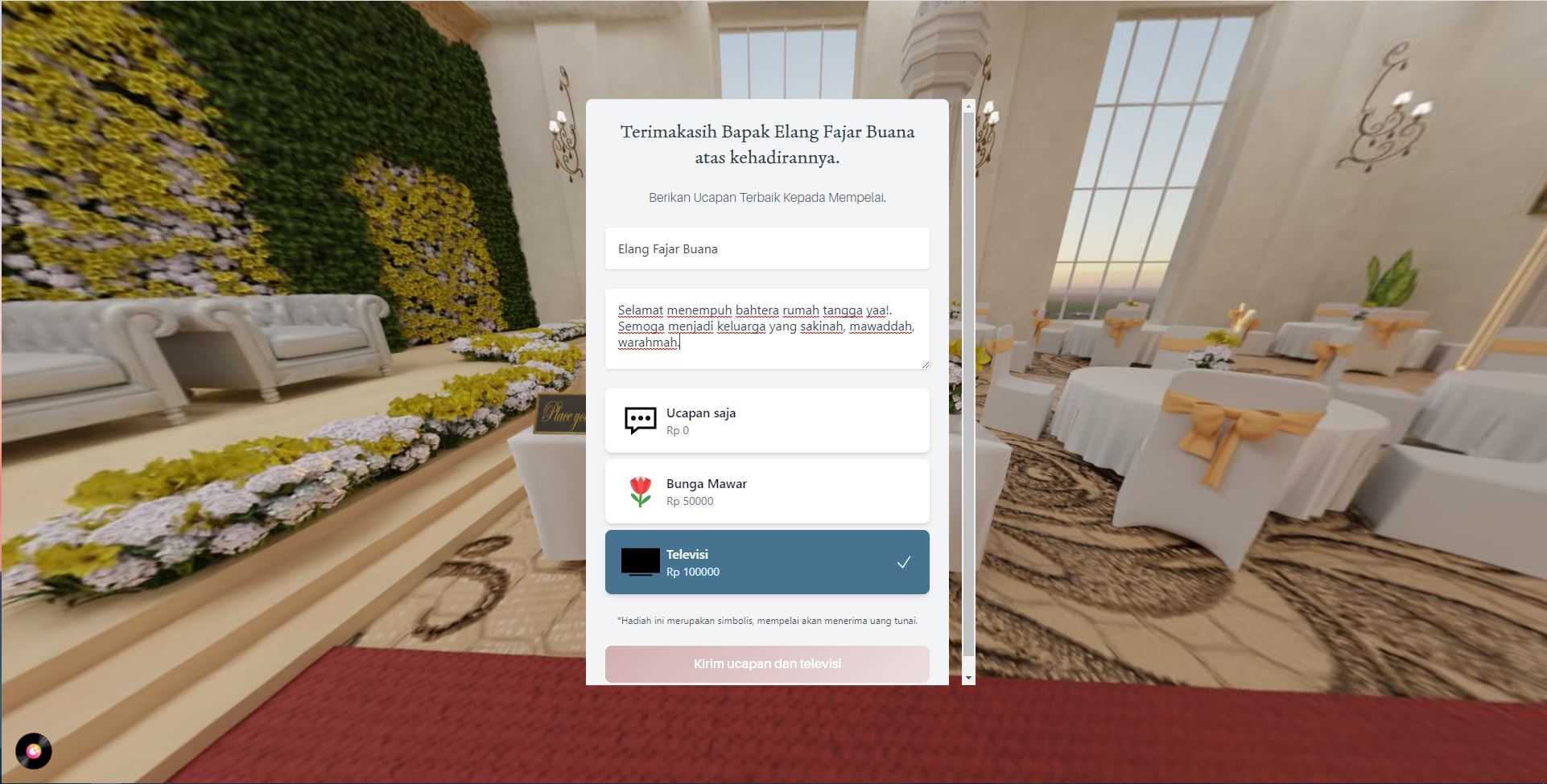 Misalnya, pada pernikahan konvensional pasangan yang ingin menikah harus menyewa sebuah gedung untuk melaksanakan pesta pernikahan. Meskipun tetap menyewa sebuah gedung, namun dengan kehadiran Virtuwed beban biaya dalam menyewa sebuah gedung bisa diminimalisir dengan bantuan digital. Bantuan disini bisa berbentuk desain background dan lainnya. Tujuannya ialah meminimalisir dana sewa gedung dan dekorasi.