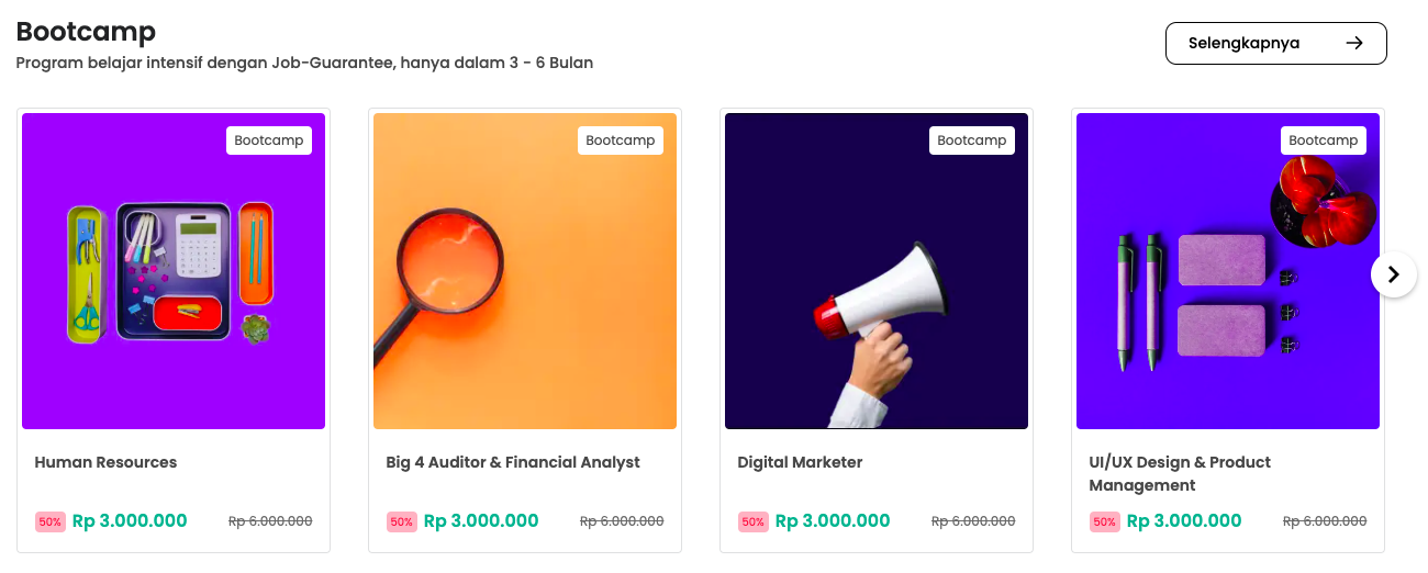 Bootcamp skill dari Harisenin sendiri merupakan sebuah metode pembelajaran secara intensif yang juga akan diselipkan career coaching dan job-guarantee setelah menjalani program selama 3-6 bulan lamanya. Jadi, selain mendapatkan ilmu mendalam selama satu periode, pelajar nantinya akan diberi konsultasi dan arahan mengenai pemilihan karir sekaligus jaminan mendapatkan pekerjaan setelah menjalani bootcamp.