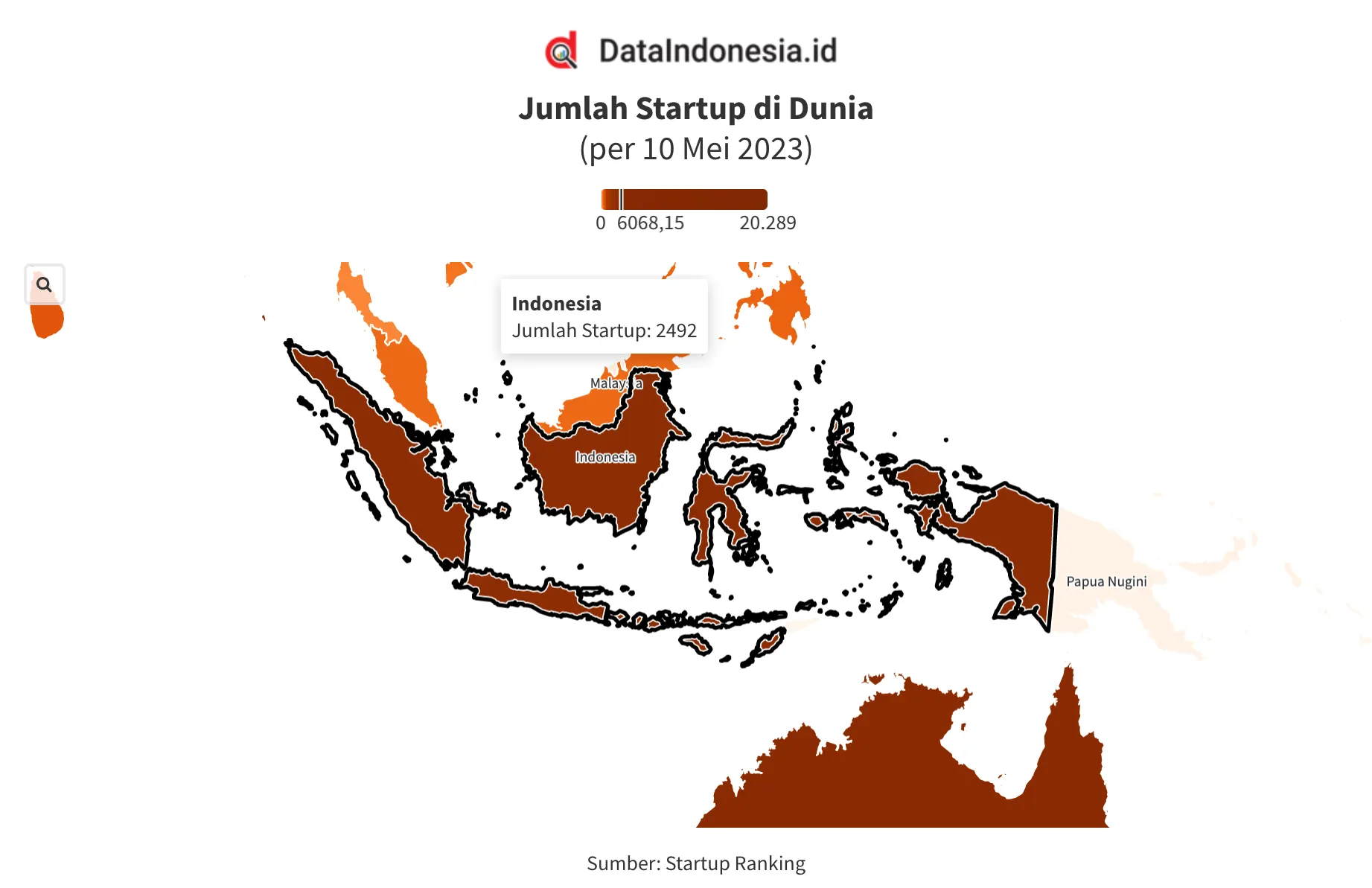 Seperti yang dilaporkan oleh Data Indonesia, bahwa berdasarkan laporan dari Startup Ranking, terdapat 144.688 startup di dunia per 10 Mei 2023 dan di antara jumlah tersebut, jumlah startup di Indonesia berada di peringkat keenam dengan 2.492 stratup.