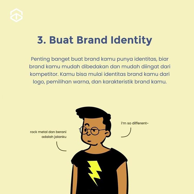 Penting banget buat brand kau punya identitas, biar brand kamu mudah dibedakan dan mudah diingat dari kompetitor. Kamu bisa mulai identitas brand kamu dari logo, pemilihan warna, dan karakteristik brand kamu.