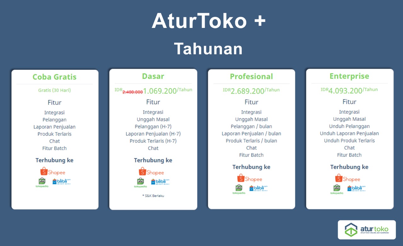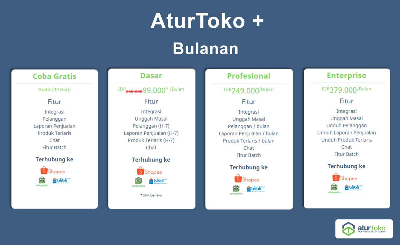 Harga terbaik dari Aturtoko adalah 99 Rb perbulan. Kamu bisa coba daftar di Aturtoko.id
