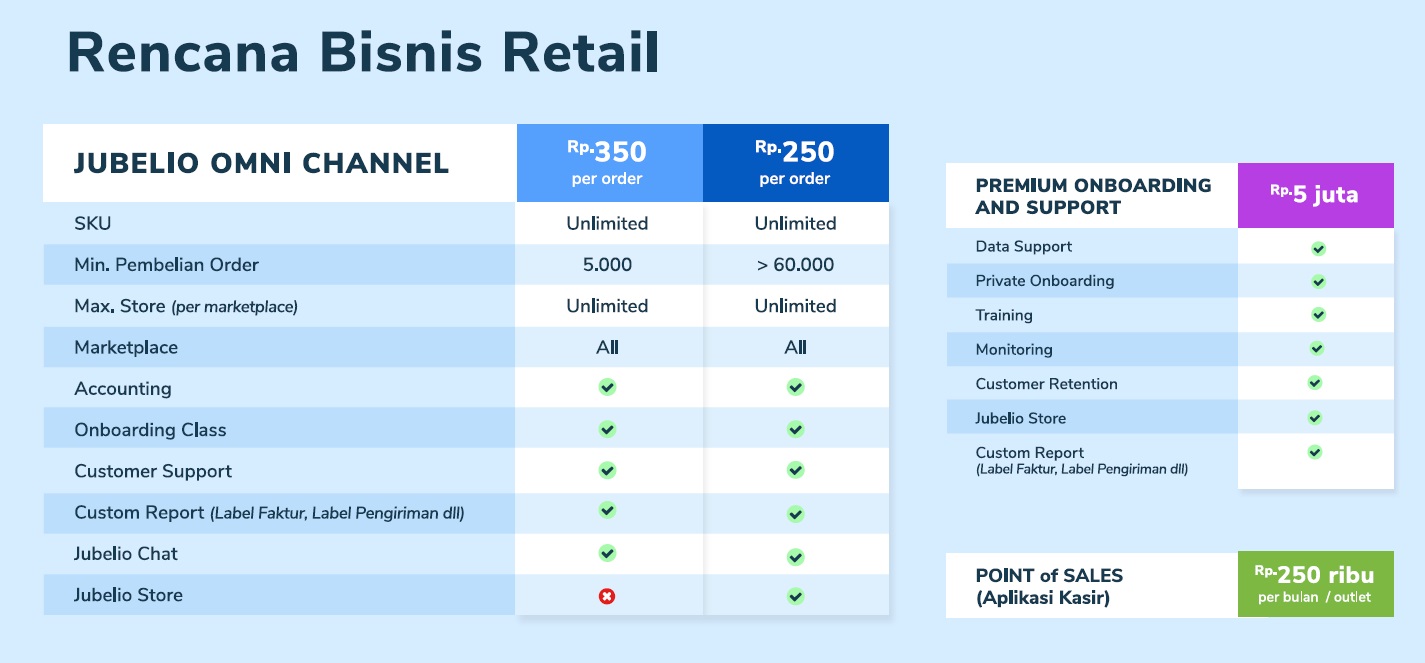 Jubelio adalah Omni Channel anak bangsa yang di bawahi PT. Guardia Teknologi Indonesia. Omni Channel Jobelio adalah Omni Channel yang bisa integrasi mulai dari pengadaan barang, listing barang ke Marketplace, sinkronisasi dan pengaturan stok, memproses pesanan, pengiriman, sampai pencatatannya ke akunting. Untuk lebih lanjut kamu bisa mengunjungi Website Jubelio disini (www.Jubelio.com).