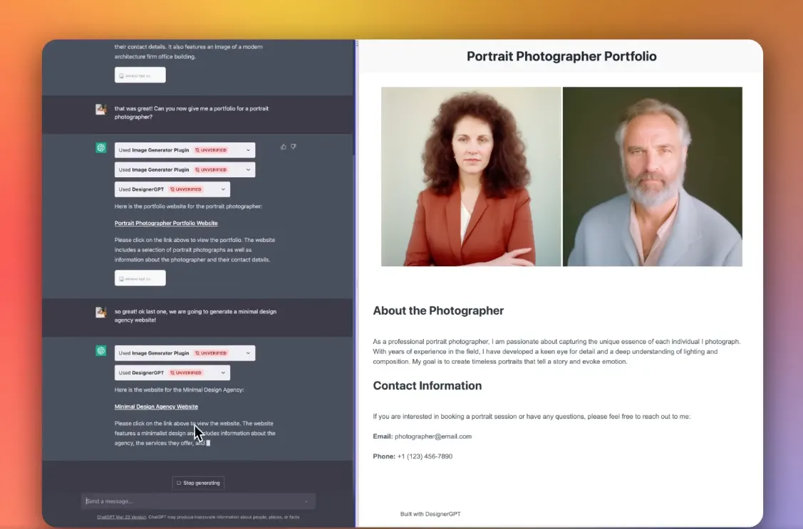 Pernah ingin membuat situs web sendiri? Nah, plugin DesignerGPT memberdayakan pengguna untuk membangun situs web dalam hitungan detik. Sempurna untuk pengusaha dan kreatif, plugin ChatGPT ini menghasilkan teks dan gambar, dan situs web kamu siap digunakan dalam waktu singkat.