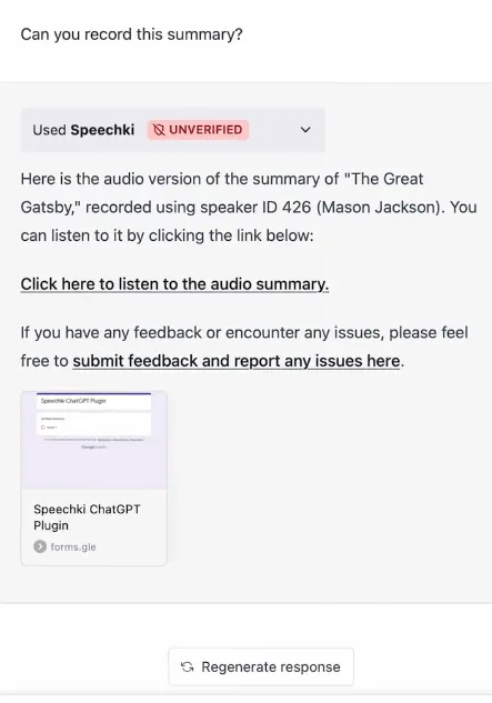 Ubah teks menjadi audio berkualitas tinggi dengan plugin Speechki untuk ChatGPT. Sempurna untuk podcaster, pembuat buku audio, dan produser konten, plugin ini memungkinkan kamu untuk berbagi audio yang dihasilkan di mana saja. Membuat episode podcast atau buku audio dengan mudah, cukup buat teks, minta audio dari ChatGPT, dan bagikan mahakarya kamu kepada dunia.