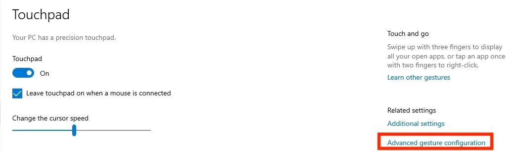 Selain gesture satu dan dua jari, touchpad laptop Windows juga dapat dinavigasikan menggunakan tiga atau empat jari. Untuk mengaktifkannya, kamu perlu mengklik opsi “Advanced Gesture Configuration” pada bagian “Related Settings” yang terletak di bagian kanan atas menu pengaturan “Touchpad”.