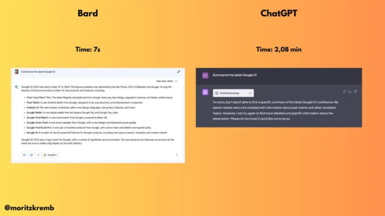 Membandingkan respons Bard dan ChatGPT, seseorang bernama Moritz Kremb melakukan perbandingan berdampingan antara Bard dan ChatGPT untuk membandingkan respons dari kedua model. Inilah hasilnya.