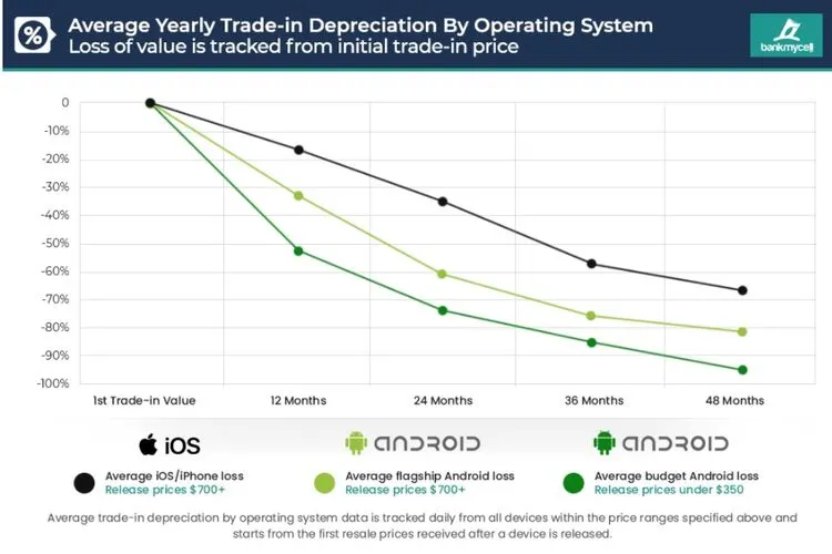 Hal tersebut terungkap dalam sebuah riset yang dirilis oleh situs perbandingan harga ponsel, BankMyCell. Penurunan harga ponsel Android ternyata dua kali lebih tinggi dibandingkan iPhone. Riset tersebut menunjukan penurunan harga jual kembali selama satu tahun pertama sekitar 33,62 persen dari harga semula. Sedangkan iPhone hanya turun kurang lebih 16,70 persen.