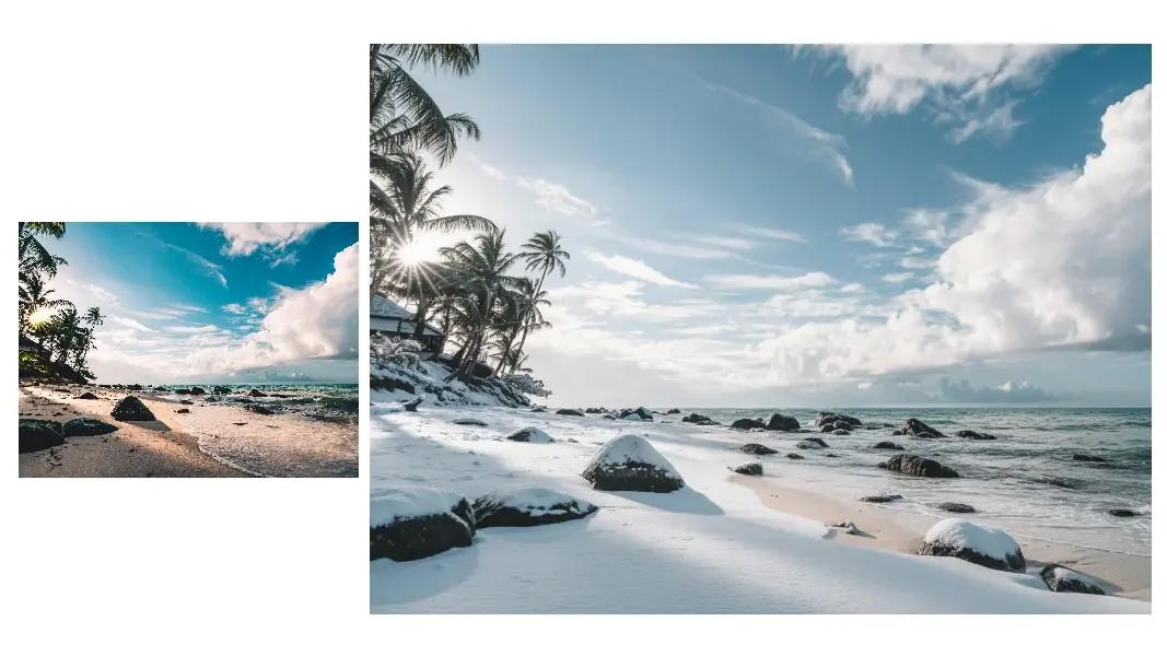 “Ubah foto pantai musim panas ini menjadi pemandangan musim dingin bersalju.”