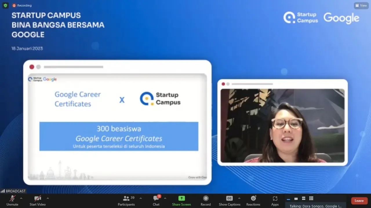 “Dengan hadirnya inisiatif ini kami berharap dapat terus berharap dapat terus membantu masyarakat Indonesia agar siap menghadapi era digitalisasi dan mendapatkan pekerjaan yang kini banyak dibutuhkan, seperti IT Support, Data Anaystics, Project Management, dan UX Desaign,” jelas Dora Songso dalam konferensi pers Google dengan Startup Campus pada Rabu, 18 Januari 2023.yang disimak secara online.