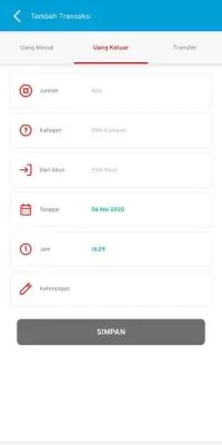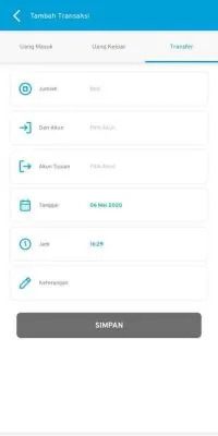Abis gue klik, muncul deh tiga kolom yang punya judul dan form yang beda-beda. Ada ‘Uang Masuk’, ‘Uang Keluar’, dan ‘Transfer’. Hmmmm menarik! Gue suka yang mendetail begini, nih!