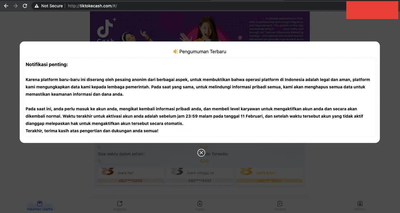 Walaupun sudah diblokir oleh Kominfo, berdasarkan pantauan Teknologi.id, pada hari Kamis (11/2) pukul 09.01 WIB, situs tiktokecash.com masih dapat dibuka. Hanya saja saat dibuka, muncul notifikasi yang menyebutkan bahwa pihaknya baru diserang oleh pesaing anonim dari berbagai aspek dan sedang berupaya untuk membuktikan bahwa platform itu aman dan legal.