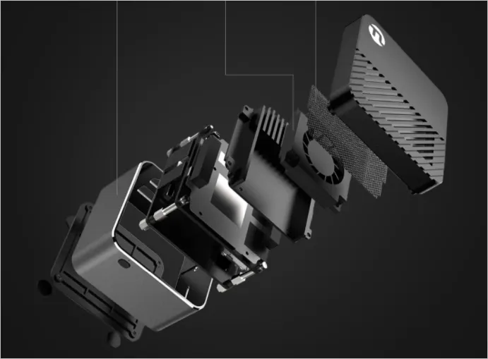 Perangkat ini kira-kira berukuran 62 x 62 x 42 mm dan memiliki bobot seberat 145 gram. Selain itu, dibekali juga dengan prosesor Intel Celeron J4125 dan kipas pendingin kecil untuk mencegah panas berlebih. Mini PC ini pun dilengkapi dengan memori LPDDR4 6GB hingga 8GB dan dapat menampung satu hard drive M.2 SSD.