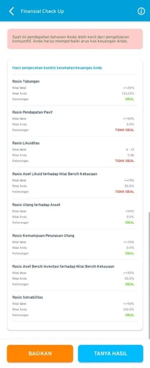 Nah, beres gue ngisi semua data yang diminta, gue akhirnya dapat hasil rasio keuangan gue, apakah ideal atau tidak.