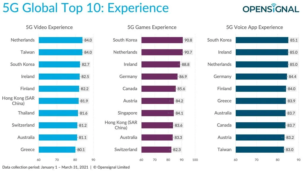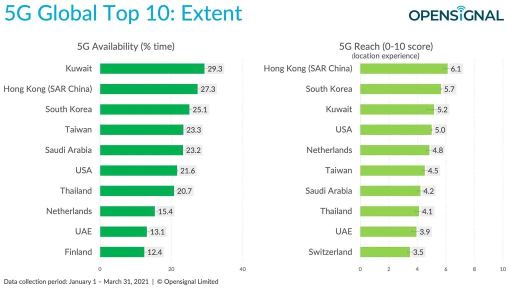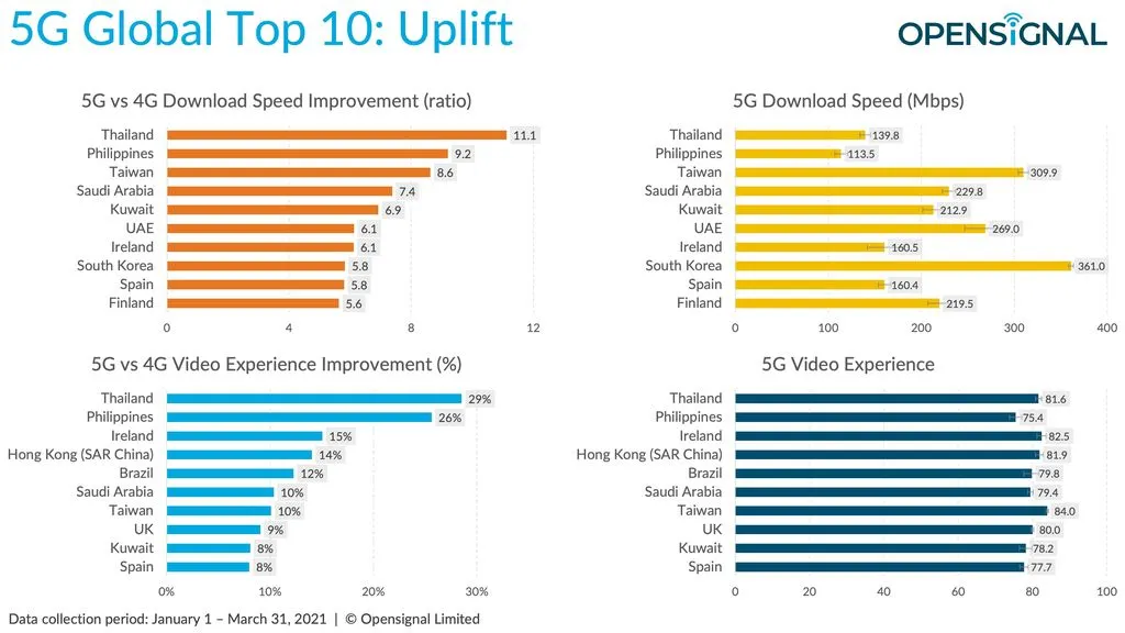 Meskipun Korea Selatan ada di urutan teratas, namun bila urusan puncak kecepatan download 5G adalah Uni Emirat Arab (863 Mbps) dan kecepatan upload 5G tercepat yaitu Taiwan (36,7 Mbps).