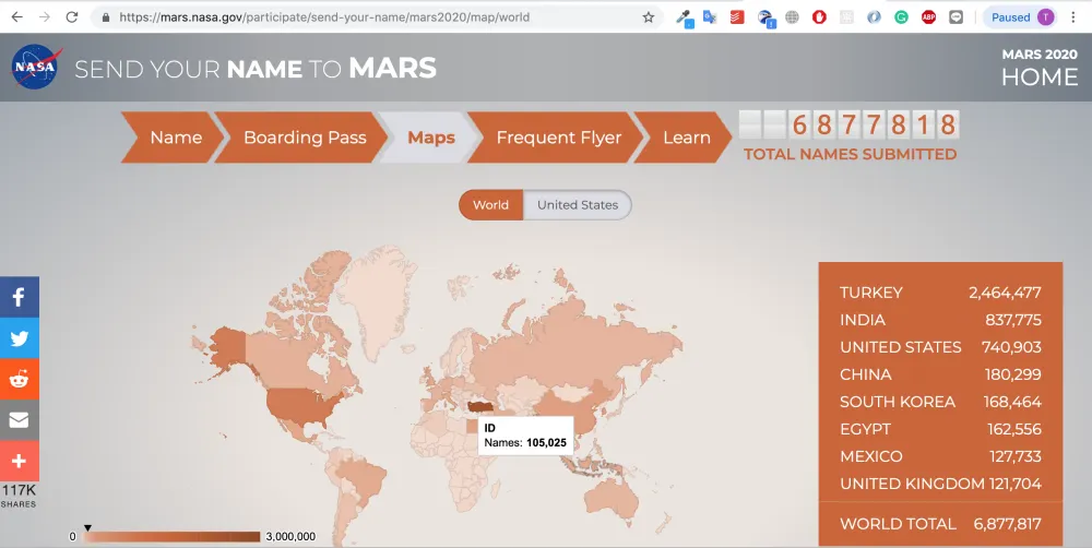 Terlihat jumlah sementara pendaftaran nama asal Indonesia untuk dikirimkan ke Mars.. Foto: Screenshot