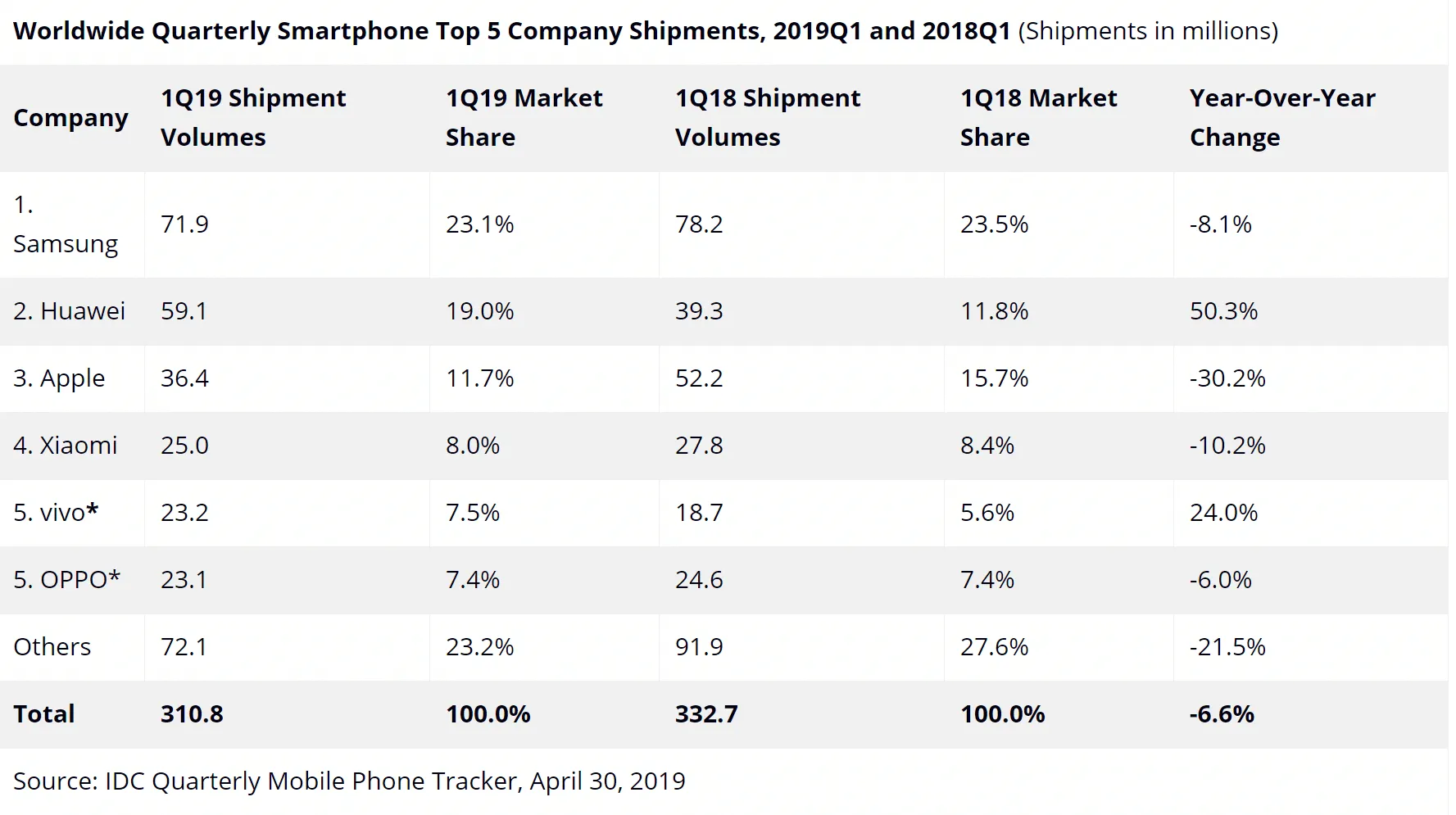 Ada sebanyak 310.8 juta unit smartphone yang dikirimkan pada Q1 tahun ini. Menurut laporan IDC, jumlah ini menurun lebih dari 20 juta unit dari Q1 2018, di mana pada saat itu pasar ponsel di dunia berhasil mengapalkan sebanyak 332,7 juta unit.