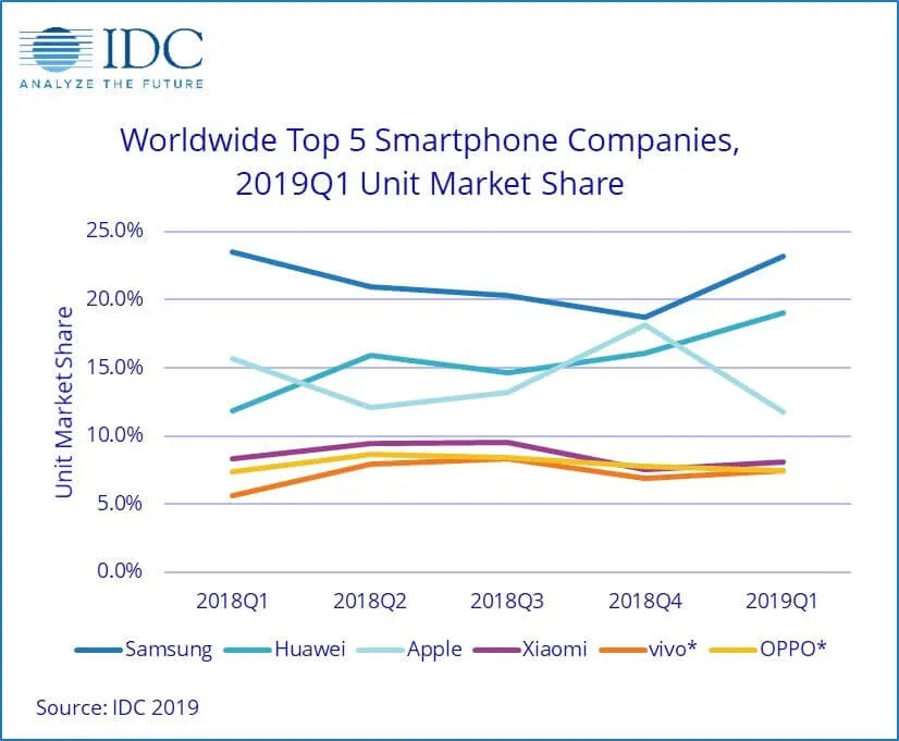 Pada kuartal pertama 2019 ini, Samsung masih memimpin dengan jumlah pangsa pasar terbesar yakni sekitar 23.1% dari pasar smartphone global. Akan tetapi, jumlah ini juga menurun sekitar 8.1 persen dari Q1 tahun 2018 lalu.
