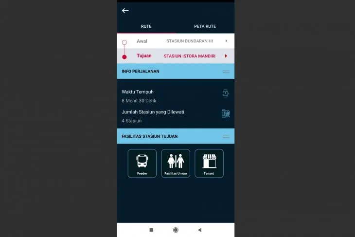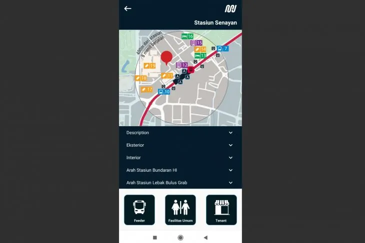 Jika ingin melihat informasi mengenai stasiun tujuan, pengguna bisa mengetuk ikon menu di pojok kiri atas dan pilih fitur "Informasi". Informasi yang diberikan antara lain fasilitas yang tersedia dan gerai penjual yang ada di stasiun tersebut.