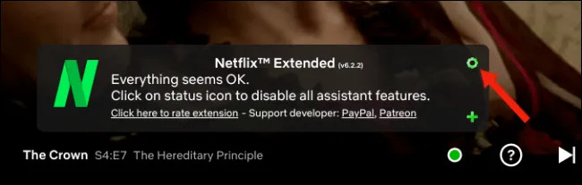 Ekstensi ini akan menampilkan tombol titik (dot) hijau pada pemutar Netflix yang berjalan di Chrome. Arahkan kursor ke titik tersebut dan klik ikon gerigi kecil untuk menampilkan fitur-fitur lain dan juga pengaturan.