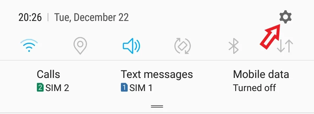 Pertama, geser layar bagian atas ke bawah untuk membuka menu notifikasi yang tersembunyi (bisa satu atau dua kali tergantung produsen perangkat yang sedang digunakan). Lalu, klik ikon gerigi untuk membuka menu Settings.