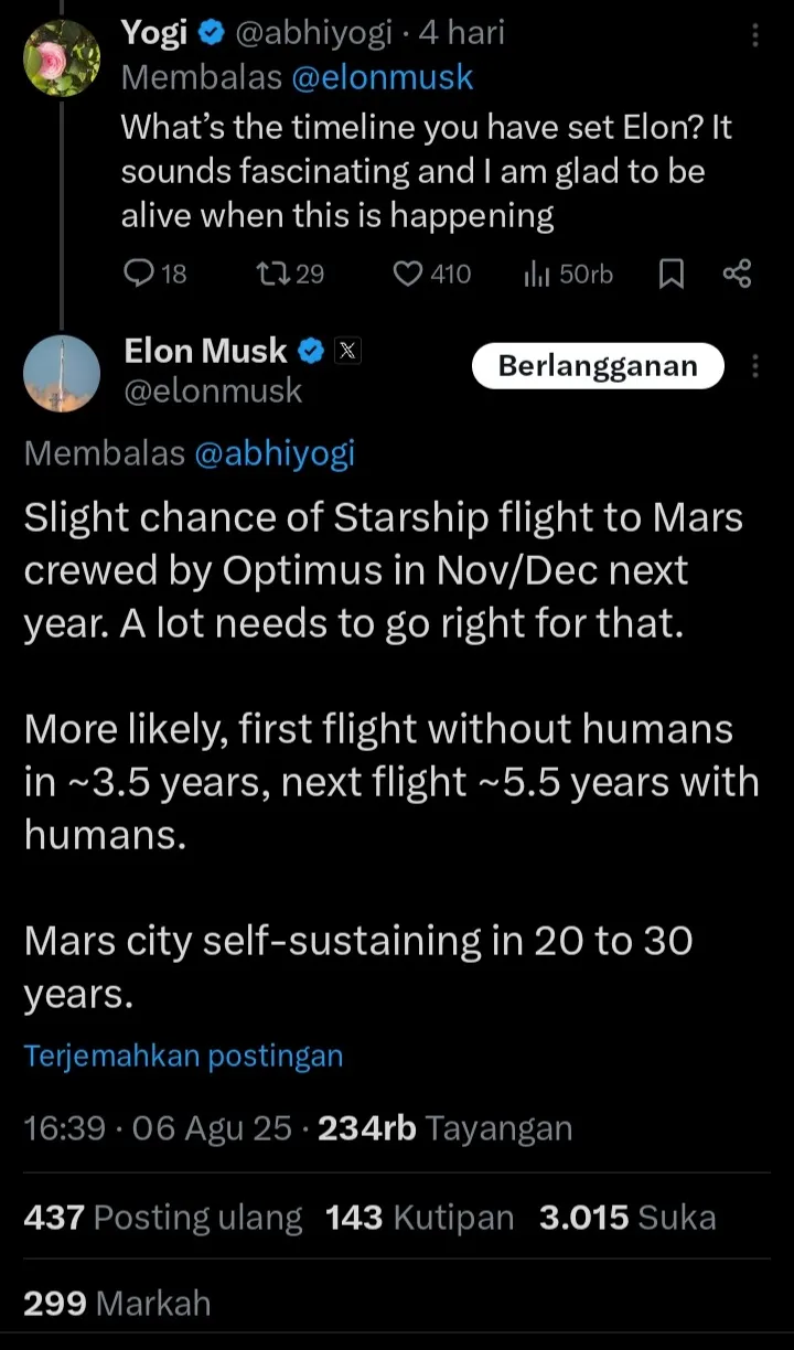 Rencana ini terungkap dari balasan Musk di X (Twitter) kepada seorang pengguna yang menanyakan timeline keberangkatan ke Mars. Musk menjelaskan: