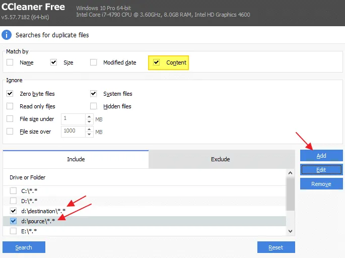 CCleaner merupakan salah satu alat yang populer diantara yang lainnya dalam daftar ini. Fitur utama CCleaner adalah menghapus file-file sampah yang bersifat sementara, namun CCleaner juga dilengkapi dengan fitur lain, salah satunya adalah pendeteksi file terduplikat. Fitur ini bisa digunakan diseluruh versi CCleaner, sehingga tidak perlu versi Pro untuk menggunakannya.