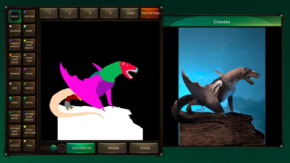 Caranya hanya dengan sketsa sebuah makhluk seperti monster pada aplikasi pilihan dan upload ke Chimera Painter. Dan tunjukkan bagian seperti wings, muzzle, atau claws dan sebagainya setelah itu klik Transform. Atau jika ingin inspirasi lain, tool juga menyediakan gambar pramuat.