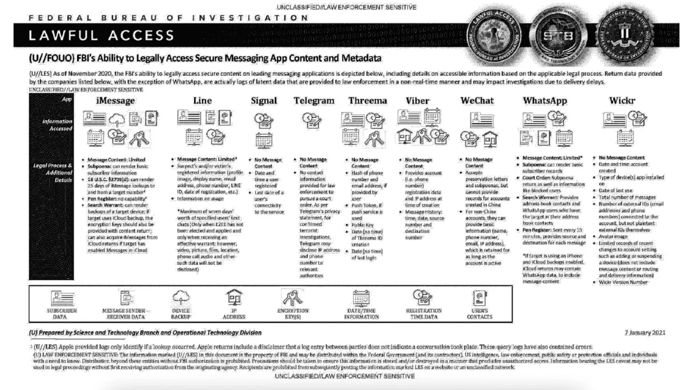 Namun rupanya, berdasarkan laporan terbaru Rolling Stone, dilansir dari Daily Star, terungkap sebuah dokumen Biro Investigasi Federal Amerika Serikat (FBI) yang bocor berisikan keterangan bahwa badan intelijen dapat meminta data pribadi pengguna di lebih dari sembilan layanan pesan terenkripsi.