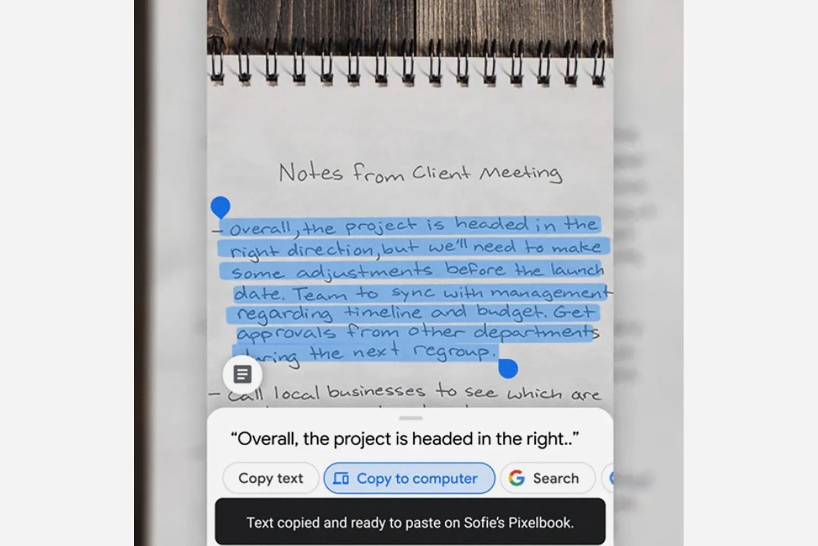 Google Lens juga mendukung fitur Copy to Computer yang memungkinkan pengguna untuk menempelkan teks ke perangkat lain, dengan syarat akun yang sama login dikedua device. Beberapa kesalahan deteksi penulisan rentan terjadi apabila tulisan tangan tidak rapi.