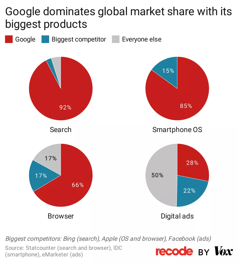 Pencarian Google dipakai lebih dari 90 persen pangsa pasar dan lebih dari 80 persen smartphone menggunakan sistem operasi milik Google secara global. Kritikus mengatakan Google menggunakan dominasi itu untuk memperkuat lini bisnis lainnya.