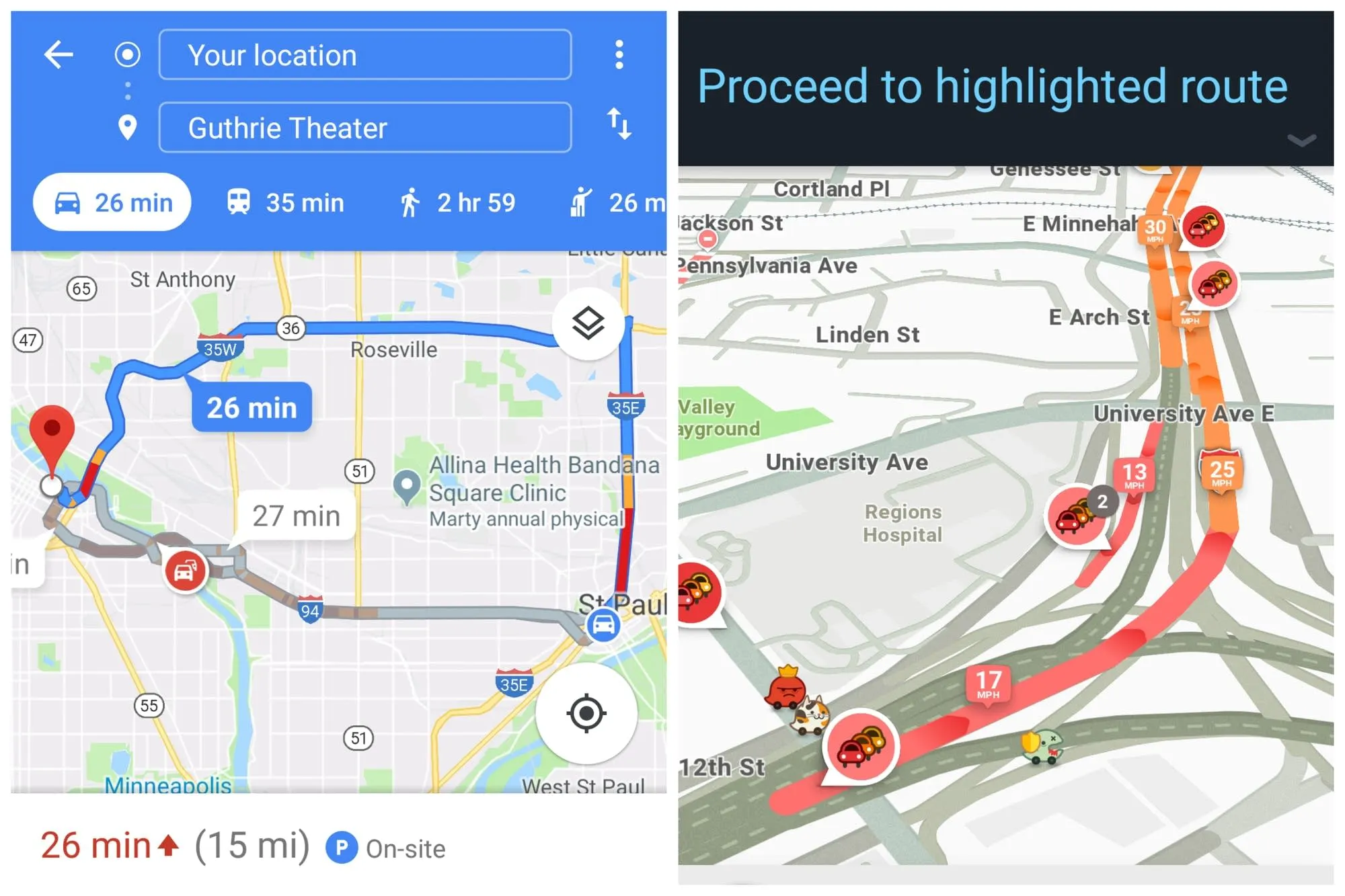 Dalam hal ini Waze menjadi pilihan terbaik anda ketika telah berada di sebuah kendaraan dan ingin mencari tahu rute tercepat ke suatu tempat. Waze memiliki beberapa informasi lalu lintas yang sama dengan Google Maps, tetapi Waze menyediakan waktu yang nyata dengan pengemudi terdekat lainnya yang menggunakan aplikasi ini.