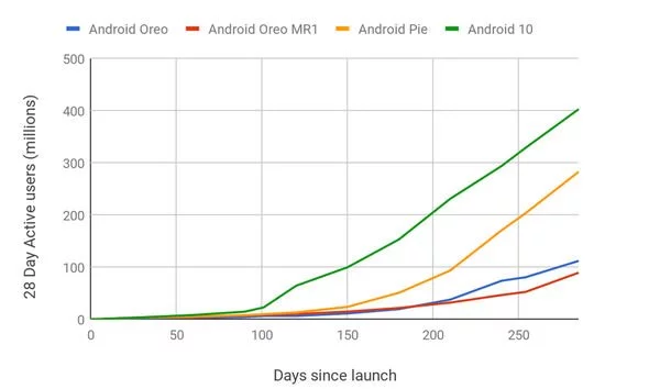 Melalui grafik yang dipost Google, terlihat bahwa pengguna Android 10 jauh lebih baik daripada Android Oreo yang rilis tahun 2017. Versi tersebut berjalan pada 10 juta perangkat dalam waktu 5 bulan dan baru mencapai 100 juta setelah setahun rilis. Android 10 kini telah terpasang di lebih dari 400 juta perangkat, melewati seluruh versi sebelumnya.