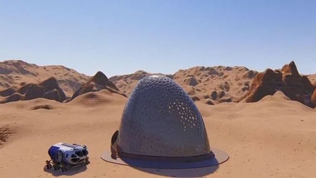 Robot kecil dikerahkan untuk mencari bahan bangunan dari material yang tersedia di Mars. Setelah satu bangunan selesai, roket ini akan mengangkat tubuh roket dan bergeser untuk membangun rumah berikutnya.
