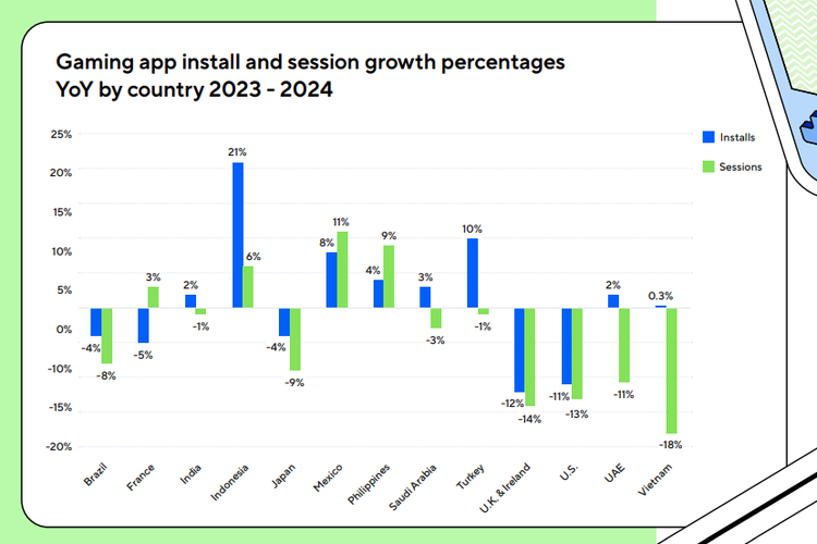 Selain rekor durasi bermain, Indonesia juga mencatatkan peningkatan tajam dalam jumlah instalasi game mobile. Pada 2024, angka instalasi meningkat hingga 21 persen dibanding tahun sebelumnya, menjadikannya pertumbuhan tertinggi di dunia. Peningkatan ini didorong oleh popularitas berbagai genre, mulai dari hyper casual hingga role-playing game (RPG) yang semakin diminati oleh pengguna muda.