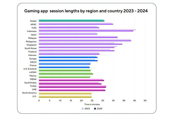 Adjust menjelaskan bahwa istilah “per sesi” merujuk pada momen ketika seseorang membuka satu game di ponselnya, memainkannya, lalu menutupnya. Jadi, durasi 44 menit tersebut bukan total waktu bermain per hari, melainkan lamanya satu kali sesi bermain dalam satu game. Hal ini menunjukkan bahwa pengguna di Indonesia cenderung bertahan lebih lama saat memainkan satu game, yang menandakan tingkat loyalitas dan keterikatan yang tinggi terhadap game yang dimainkan.