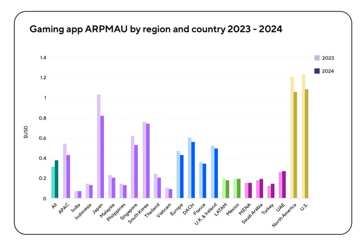Meskipun aktivitas bermain dan jumlah instalasi tinggi, laporan Adjust mencatat bahwa pendapatan rata-rata per pengguna aktif bulanan (ARPMAU) di Indonesia masih tergolong rendah. Pada 2024, nilai ARPMAU di Indonesia hanya sekitar 0,43 dolar AS (sekitar Rp7.100), turun dari 0,54 dolar AS pada 2023. Sebagai perbandingan, Jepang mencatat angka 0,82 dolar AS, sedangkan Amerika Serikat berada di kisaran 1,06 dolar AS.