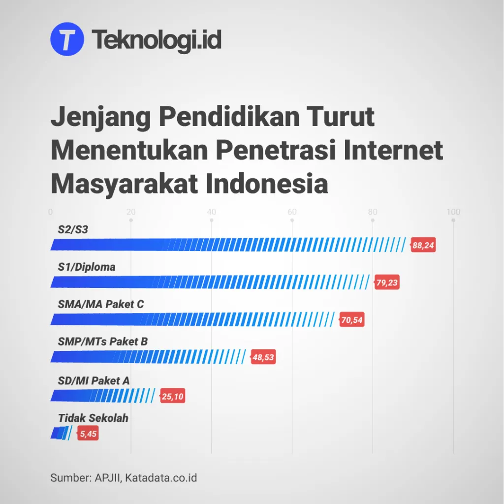 Hasil survei dari Asosiasi Penyelenggara Jasa Internet Indonesia (APJII) di tahun 2017 menunjukkan bahwa semakin tinggi jenjang pendidikan masyarakat maka semakin tinggi pula penetrasi internet. Terlihat dalam bagan di bawah ini, presentase masyarakat yang mengenyam pendidikan hingga Strata 2 (S2) dan Strata 3 (S3) mencapai 88,24%. Presentase ini mengalahkan presentase penetrasi internet dengan jenjang pendidikan lainnya.