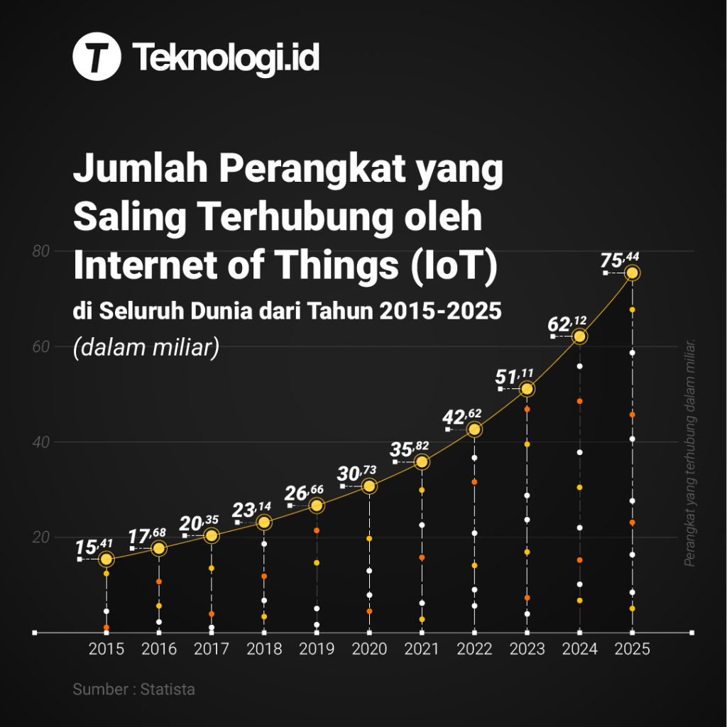 Perangkat yang Saling Terhubung oleh Internet of Things (IoT) di Seluruh Dunia dari Tahun 2015-2025 (dalam miliar).