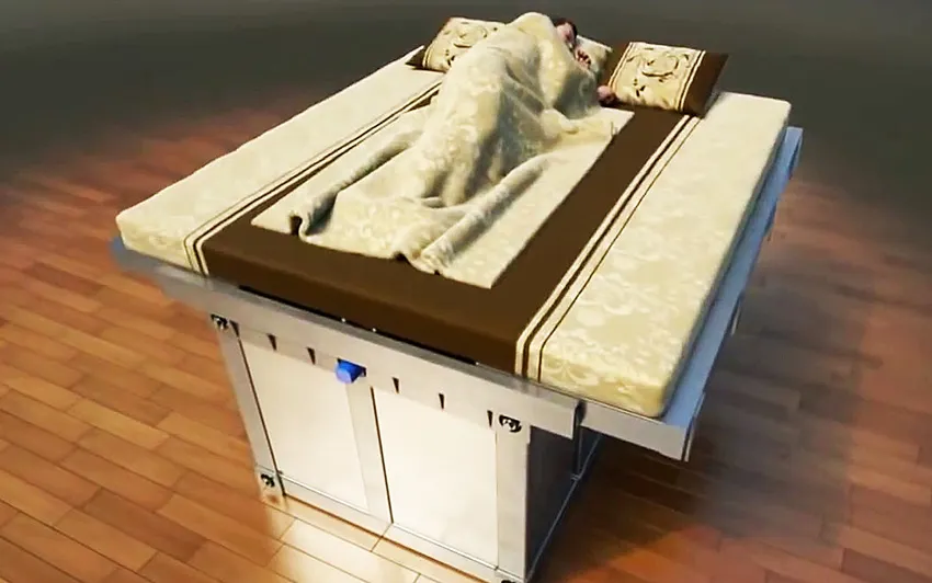 Tak berapa lama, kemudian tutup kasur berbentuk kotak itu meluncur di atas untuk melindungi penggunanya dari puing-puing yang runtuh akibat gempa. Tempat tidur ini pun dalam waktu singkat, berubah menjadi sebuah peti perlindungan.