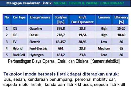 “Jika pada kondisi sekarang, mungkin akan menguntungkan ada kendaraan listrik, karena biaya listriknya lebih murah dibanding bensin, Jadi positif dan ada peluang penggunaan hybrid, Plug in Hybrid, juga full electric,” tutur Rizqon. “Peran penerapan teknologi kendaraan listrik juga sudah didukung pemerintah. Jika tidak salah juga akan ada infsentif fiskal yang diberikan, tapi tidak hanya mobil listrik tapi low carbon emission, jadi tinggal dijalakan saja,” tutur Rizqon. Rizqon menyebutkan, beberapa hal yang harus dipertimbangkan sebelum penerapan teknologi Electric Vehicle ( EV), mulai dari supply listrik memadai di rumah-rumah dan daerah, infrastruktur pengisian listrik (charging station), ketersedian spare part electric vehicle, desain kendaraan (pribadi dan angkutan umum, keamanan, serta urursan fiskal dan insentif.Artikel ini telah tayang di Kompas.com dengan judul "Indonesia Berpeluang Besar Terapkan Kendaraan Listrik", https://otomotif.kompas.com/read/2018/08/27/104200215/indonesia-berpeluang-besar-terapkan-kendaraan-listrik. Penulis : Ghulam Muhammad NayazriEditor : Azwar FerdianBaca juga: Wacana Elon Musk Bikin Mobil Listrik Murah di Tahun 2021.