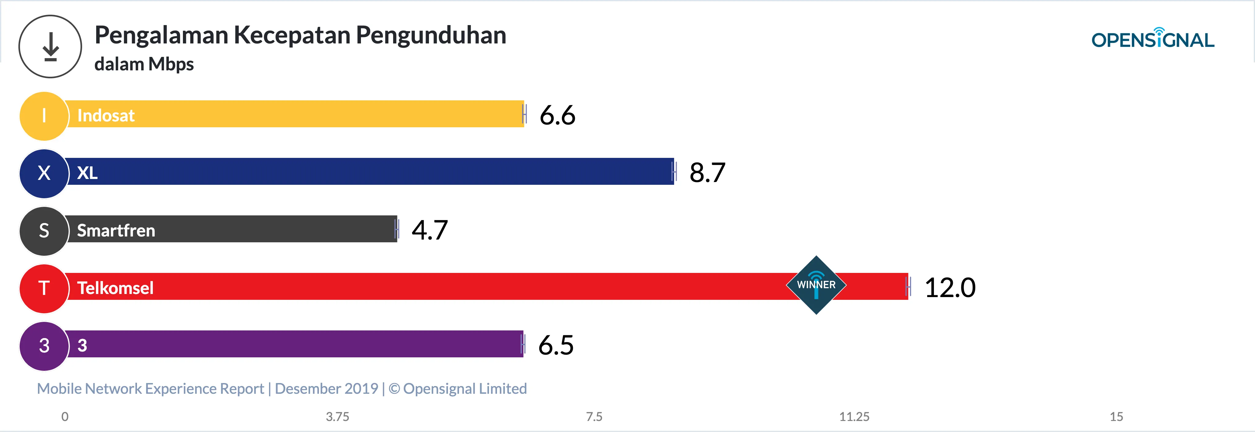 Sementara kecepatan download rata-rata Telkomsel adalah 12 Mbps atau naik 23 persen, yang juga menempatkannya di peringkat teratas.