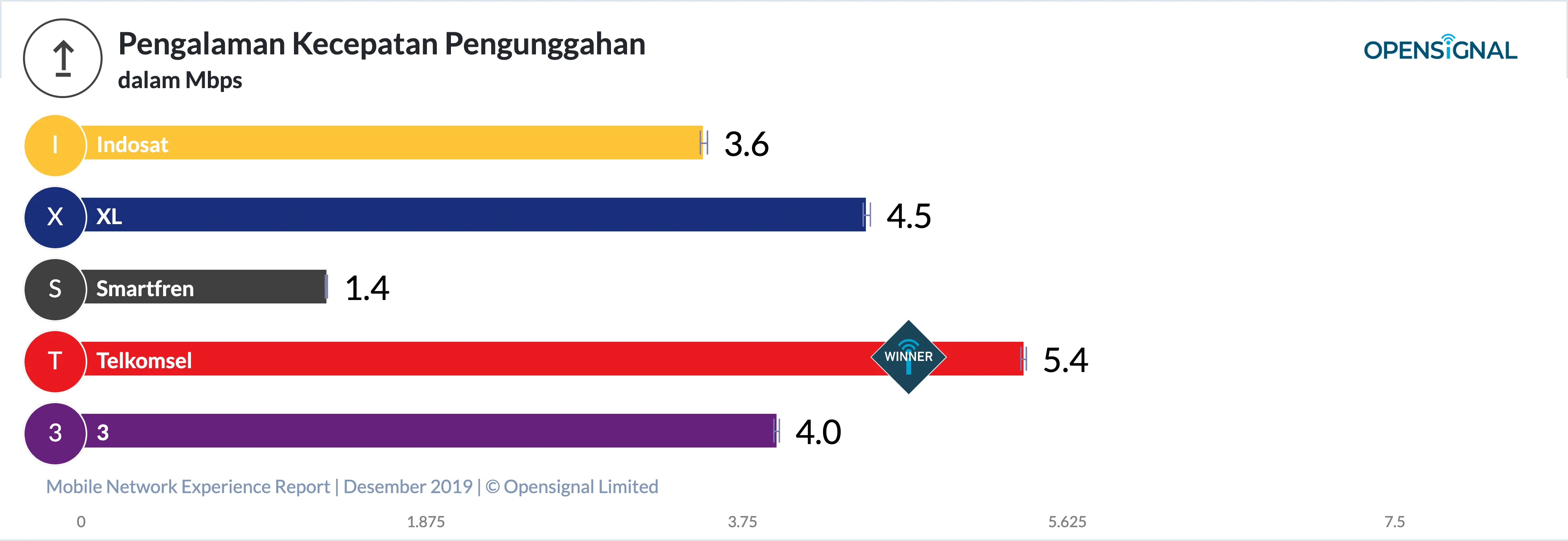 Dari total 1.854.821 perangkat yang dianalisis untuk riset OpenSignal mulai 1 Agustus sampai 29 Oktober 2019, menunjukkan perusahaan pelat merah itu masih unggul di kecepatan upload dengan kecepatan 5,4 Mbps, atau naik 46 persen.