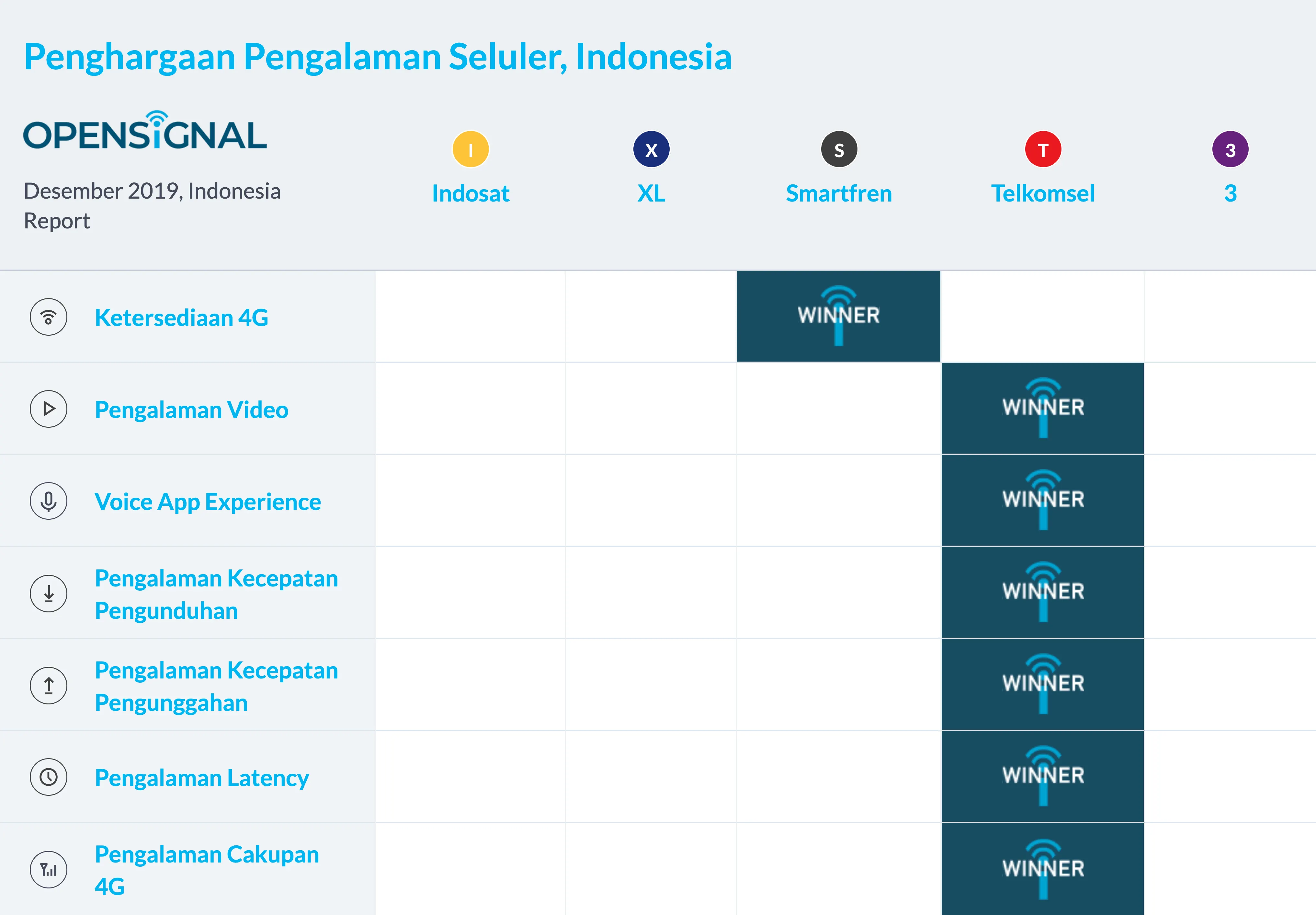 Dari ketujuh kategori penilaian, enam diantaranya berhasil dijuarai oleh Telkomsel. Di kategori pengalaman video, Telkomsel kembali menyabet peringkat pertama dengan kenaikan 4,5 poin ke angka 58,8.