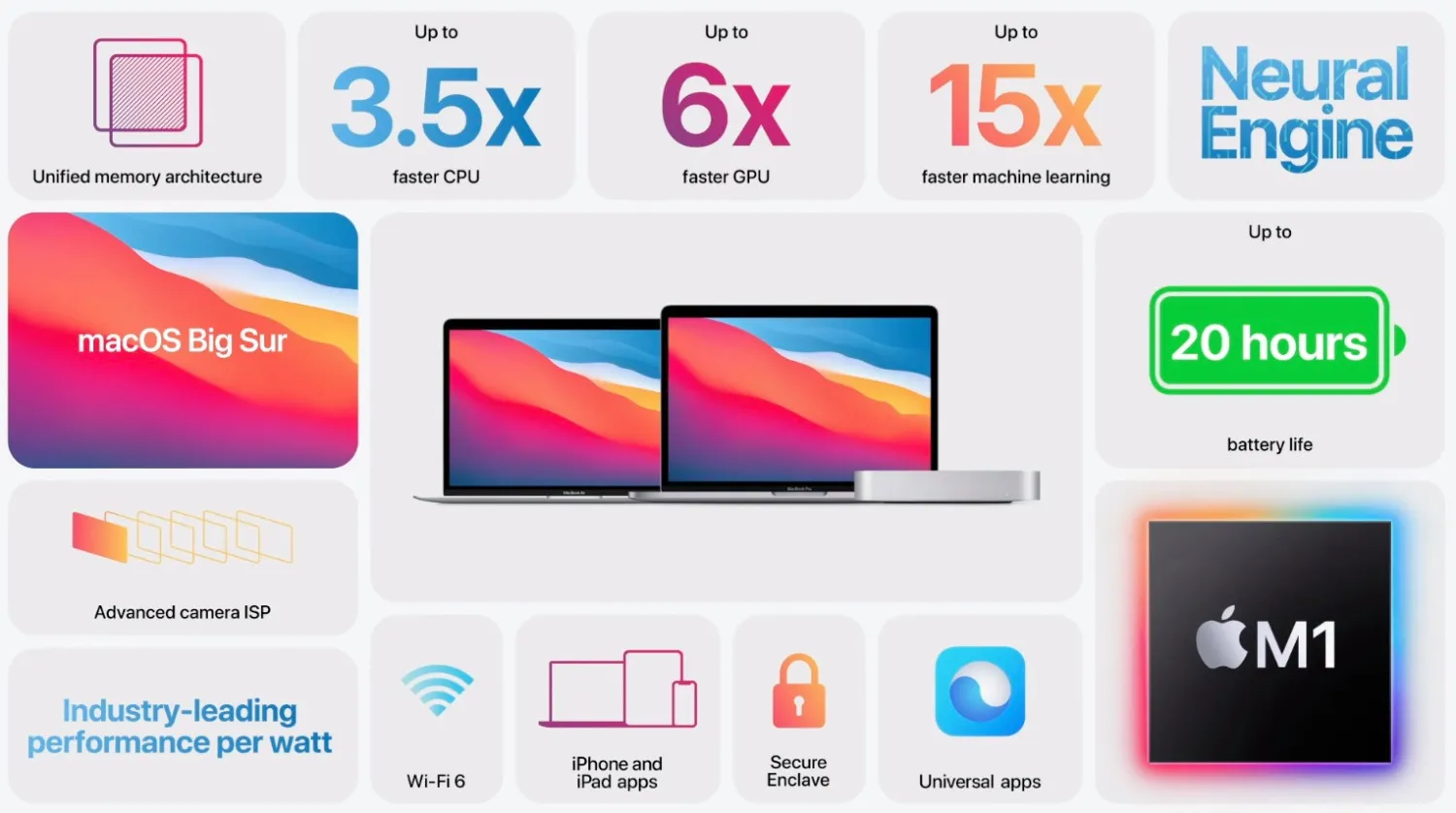 M1 ada prosesor 8 core dengan fabrikasi 5nm, sama seperti prosesor A14 yang dipakai iPhone dan iPad Air terbaru. Apple mengatakan M1 memberikan kinerja puncak yang sama seperti CPU laptop. Memiliki 4 core CPU kinerja cepat, dan 4 core dengan efisiensi tinggi. Dia juga memberikan kemampuan grafis kinerja tinggi berkat GPU (graphics processing unit) 8 core yang sudah ditingkatkan.