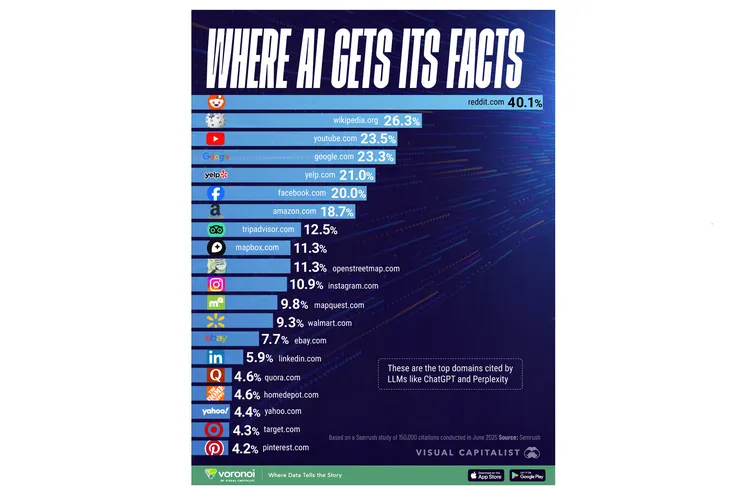 Hasilnya cukup menarik: Reddit menempati posisi teratas sebagai sumber paling sering dikutip, yakni sebesar 40,1 persen.